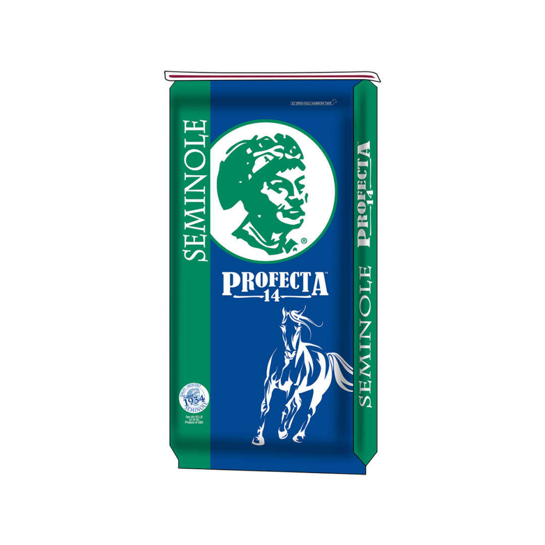 Seminole Profecta 14™ is a premium pelleted feed made with highly digestible fibers, top-quality grains, yeast culture, and a unique blend of molasses. Fortified with chelated trace minerals, antioxidants, and controlled starch levels to reduce the risk of metabolic upset, making Seminole Profecta 14™ ideal for growing, breeding and performance horses.