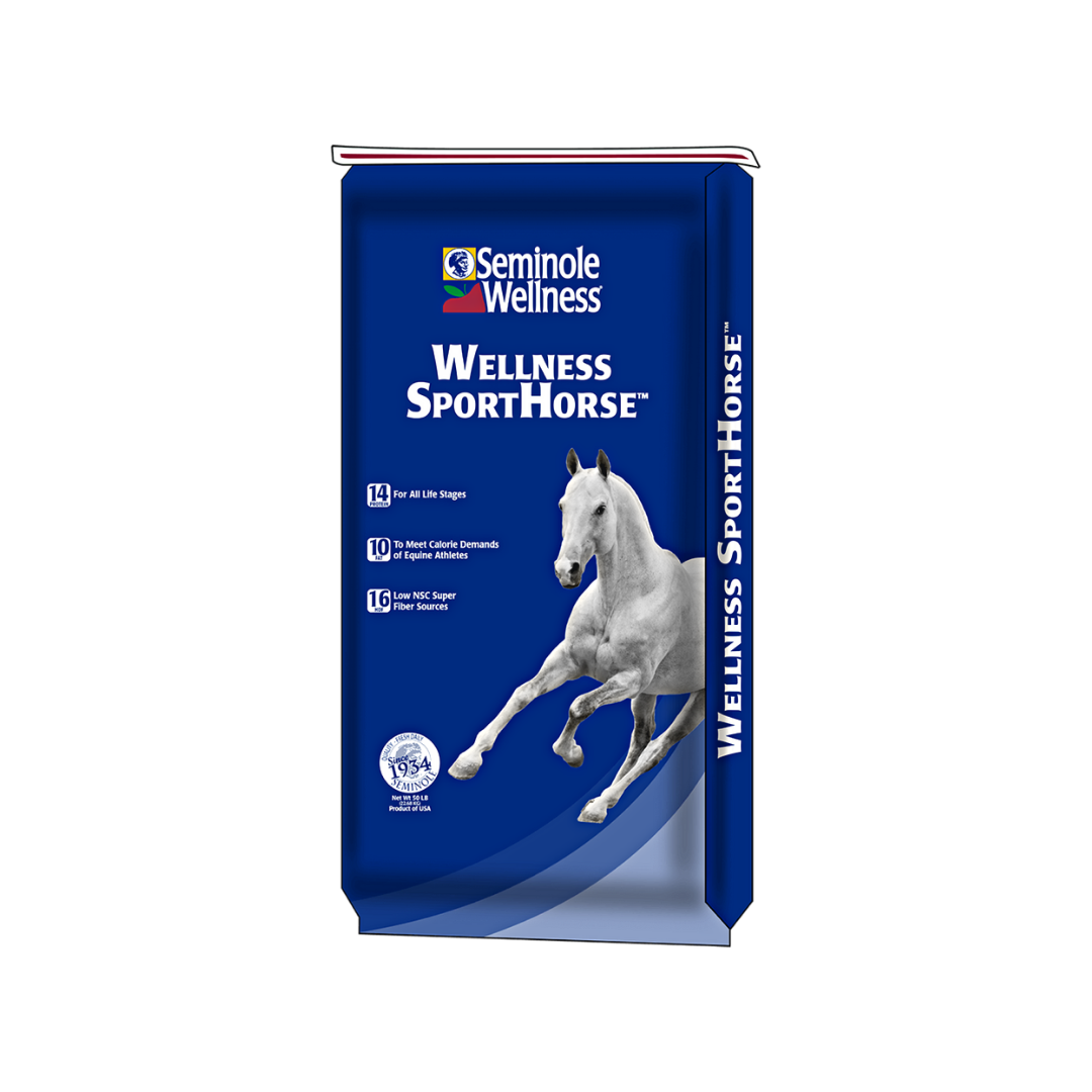 Wellness SportHorse™ is a super-premium, low-starch, high-fat, calorie-dense feed designed to provide consistent, superior nutrition at every meal. Formulated to provide not only the essential nutrients to meet the high demands of the equine athlete, but the high volume of digestible fibers in Wellness SportHorse™ also helps to reduce starch levels which research has shown to diminish the extent of developmental orthopedic disorders in the young, growing horse. An ideal choice for carb-sensitive or ulcer-prone horses, this feed contains added fat from multiple sources, including Ultra Bloom®, which is sure to provide the endurance and stamina for any sport without creating hyperactivity.