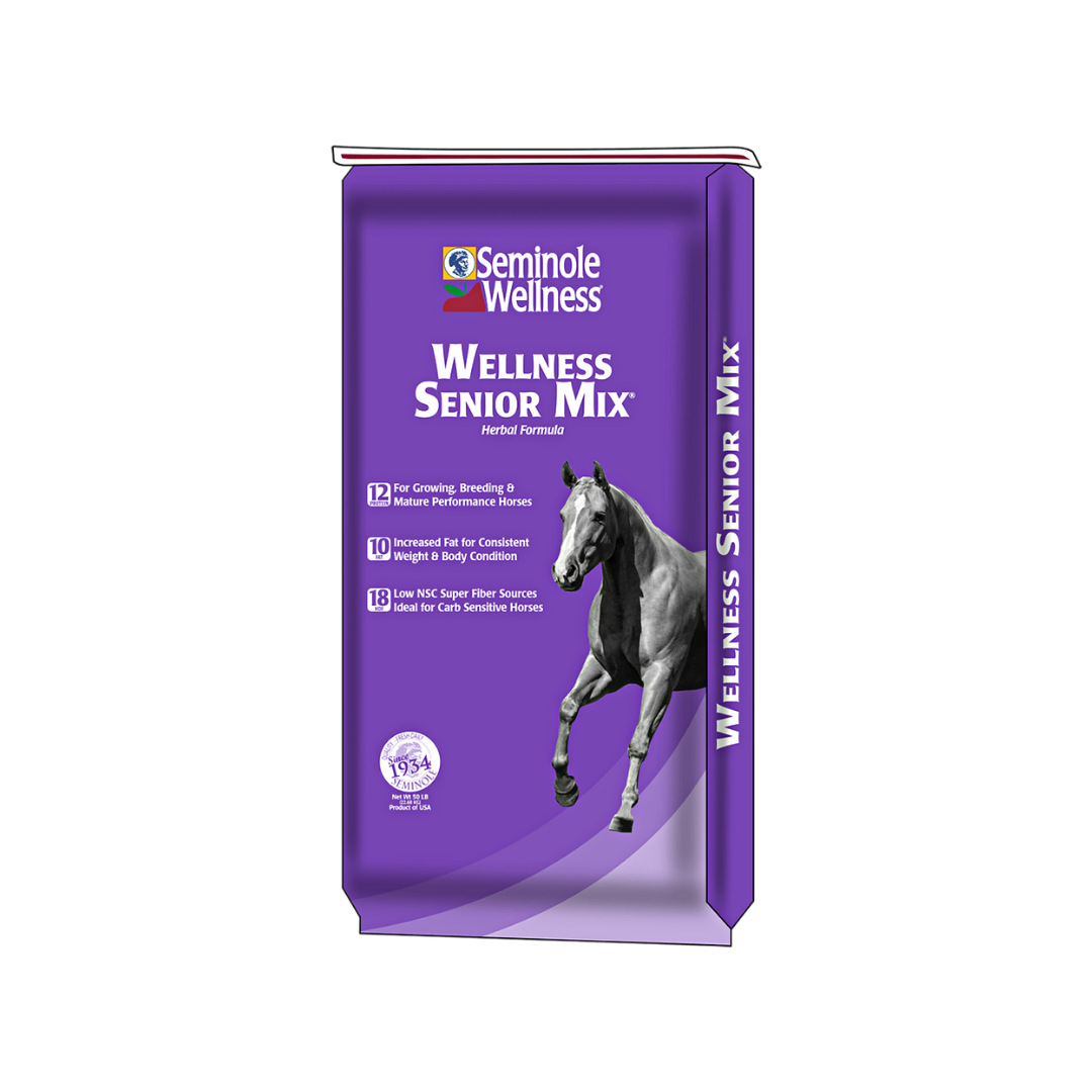 Whether feeding the yearling, equine athlete, or elder horse, Wellness Senior Mix® is scientifically formulated to support their daily nutrient demands as a super-premium, low-starch, high-fat, complete feed. The easy-to-chew form, enhanced with nine all-natural herbs, provides an exquisite flavor and increased digestibility. Wellness Senior Mix® designed for the unique needs of senior horses provides the satisfaction of receiving superior nutrition day-after-day. Wellness Senior Mix®, made with the lifetime of your equine partner in mind.