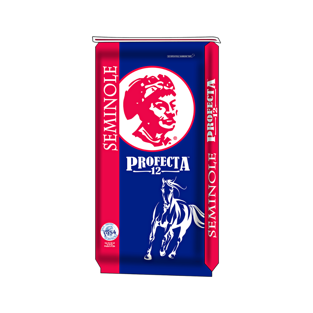 Seminole Profecta 12™ is a premium pelleted feed made with highly digestible fibers, top-quality grains, yeast culture, and a unique blend of molasses. Fortified with chelated trace minerals, antioxidants, yeast culture and controlled starch levels to reduce the risk of metabolic upset, Seminole Profecta 12™ is ideal for mature, active horses and ponies.
