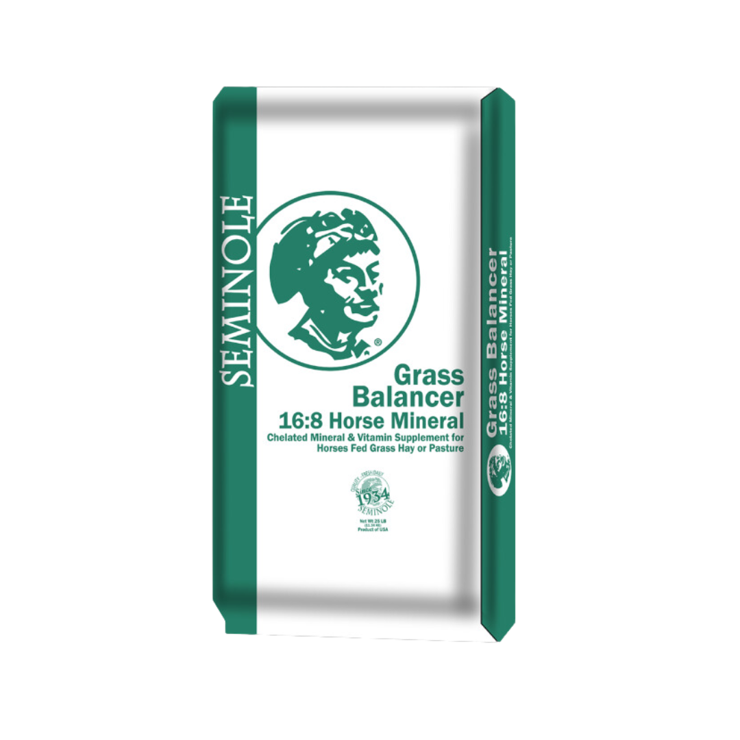 Seminole Grass Balancer 16:8 Mineral™ is a complete mineral and vitamin supplement for horses of all ages with a scientifically formulated calcium-to-phosphorus ratio of 2:1. Designed for horses consuming grass or mixed hays and pastures, Seminole Grass Balancer 16:8 Mineral should be provided free-choice to horses or used as a top-dressing with feed.