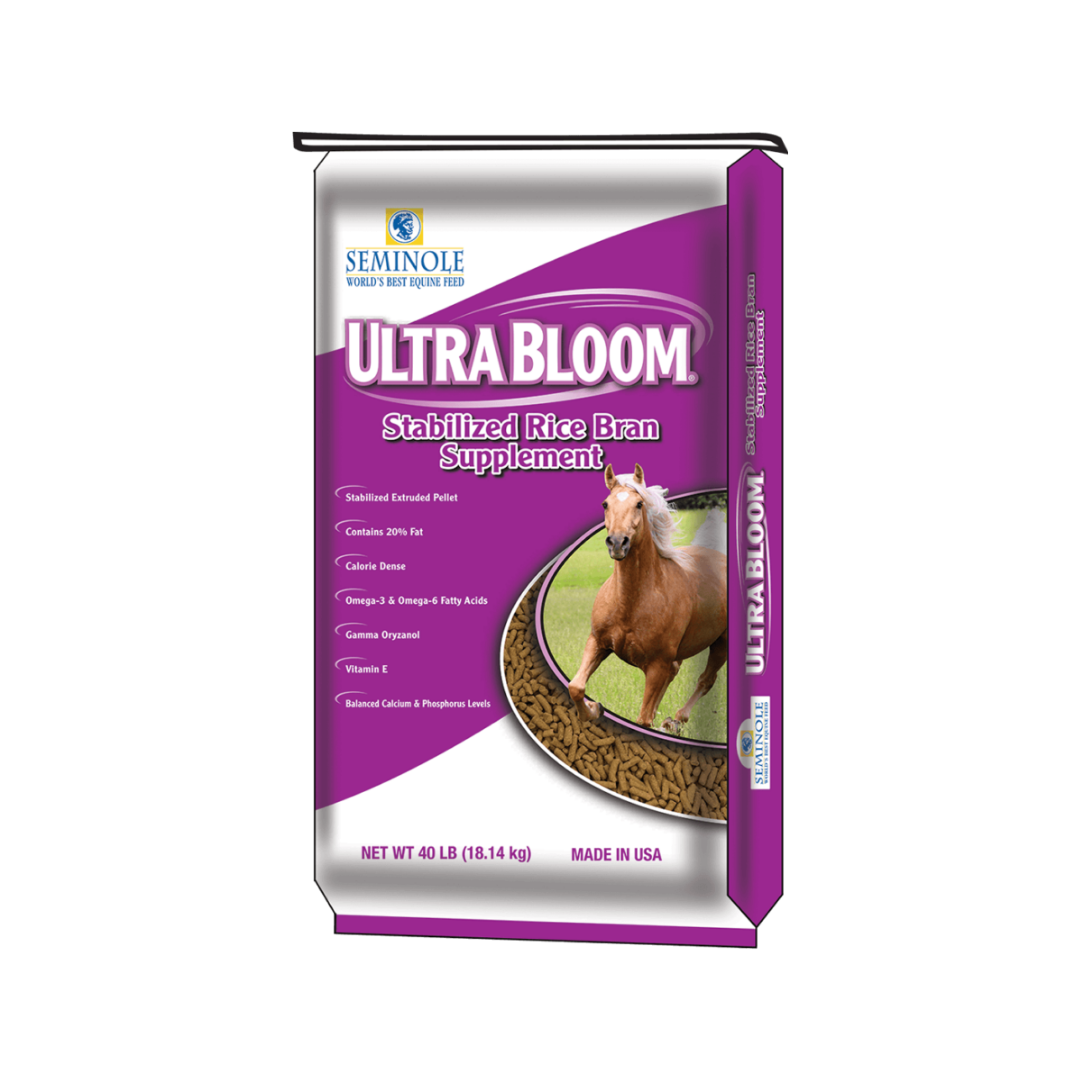 Seminole Ultra Bloom® is a high-fat stabilized rice bran supplement for growing, breeding, show and performance horses. This calorie dense, extruded pellet with naturally occurring linoleic and linolenic fatty acids is ideal for body conditioning, bloom, weight gain and stallion performance. Ultra Bloom® has balanced levels of calcium and phosphorus and contains Gamma oryzanol. This extruded pellet form is highly palatable and can be top-dressed on feed.