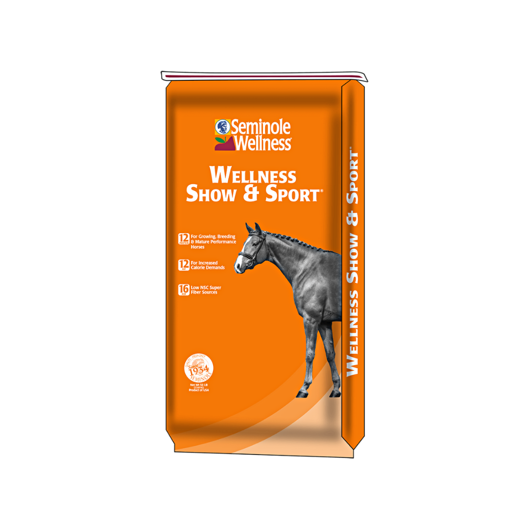 Designed for world-class performance, endurance, and show horses, this calorie-rich feed contains high digestible fibers and fat from multiple sources to deliver maximum digestibility and increased endurance. Wellness Show & Sport® is a super-premium, high-fat multi-textured feed that delivers consistent, superior nutrition by providing essential nutrients to meet the demanding schedule of the equine athlete. Enhanced with electrolytes to replenish essential nutrients lost during prolonged competition, Wellness Show & Sport® helps improve stamina and recovery throughout any show or sport.
